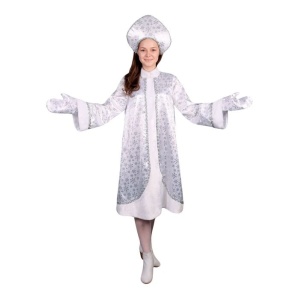 Карнавальный костюм "Снегурочка", атлас, шуба расклешённая со снежинками, кокошник, варежки, р-р 52
