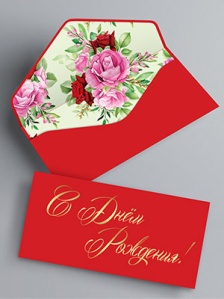 Конверты для денег, С Днем Рождения! (цветы), Красный, Металлик, 8,5*17,2 см