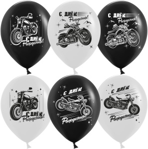 Шар (12''/30 см) С Днем Рождения! (мотоциклы), Черный/Белый, пастель, 2 ст, 25 шт.